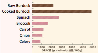 According to research by the fresh food processing company, Ajikan, and the National Fisheries University, published at The Japan Society of Cookery Science in 2009, burdock has some of the strongest anti-oxidant properties of all vegetables.